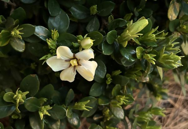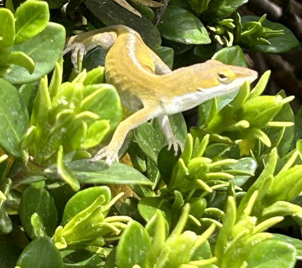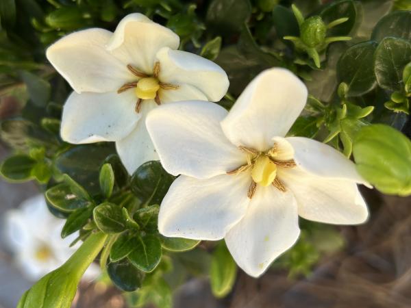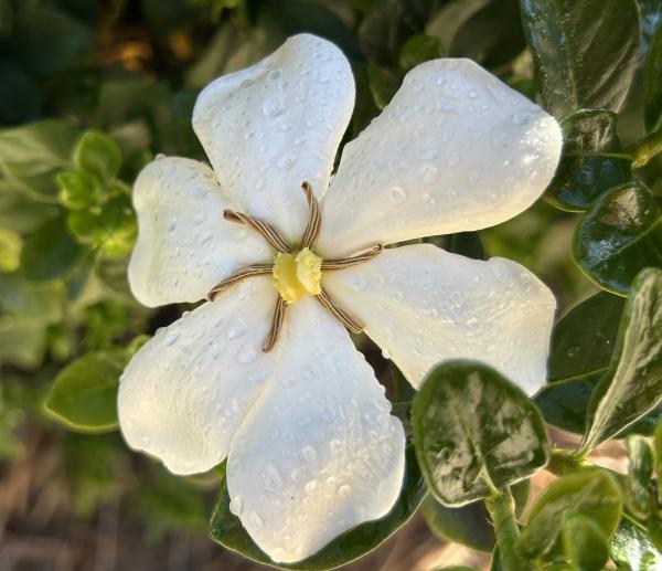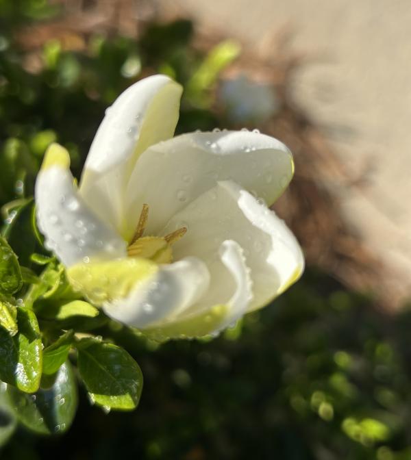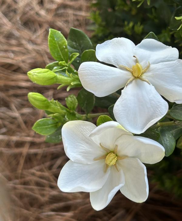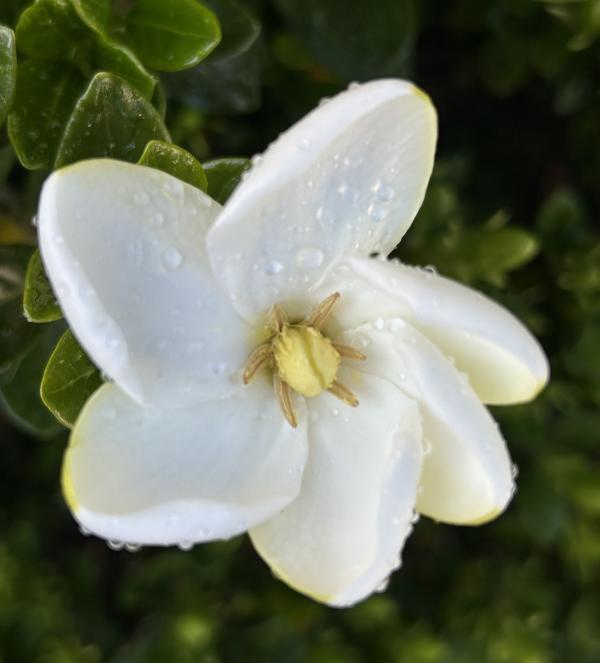 新家门前,有一簇花为我而开放就够了,它就是栀子花。去年七月初搬到夏洛特市,它花儿正茂,清香扑鼻,但我不知道它什么时候开花的,只知道它落得很晚,一直到了十一月份,气温降到摄氏零下四五度,冷霜杀死了栀子刚刚冒出的花蕾。 冷霜再一次肆虐是今年三月下旬,那时,门前那簇栀子花已经含苞很久了,可总也没有绽放。一夜霜白后,这一朵花蕾渐渐萎缩了,死去。莫非,枪打的不仅有出头鸟,还有早来的花。 4月11日,第一朵栀子花终于开放了,洁白的面孔,轻柔的清香,都彰显着纯洁的美好本性。虽然小伙伴死了,但它,继续敢为天下先,散发出春天的第一缕芳香。连小蜥蜴也为之欢心,它乳黄色的身子,在花前,在花上。 花如玉,胜于玉,是香玉。 那天,栀子花一下子冒出了许多花蕾,就几日,花儿陆续开放了,每一朵都向着我微笑。每日早上,它们是室外的第一缕芳香,花语,就在我们的交谈中,当我停下来,闻一闻花香时。 那一天是4月29日,朋友圈几位朋友发文,纪念林昭遇难56周年。栀子花面上好多露珠,是感时花溅泪吗? 2024.5.1