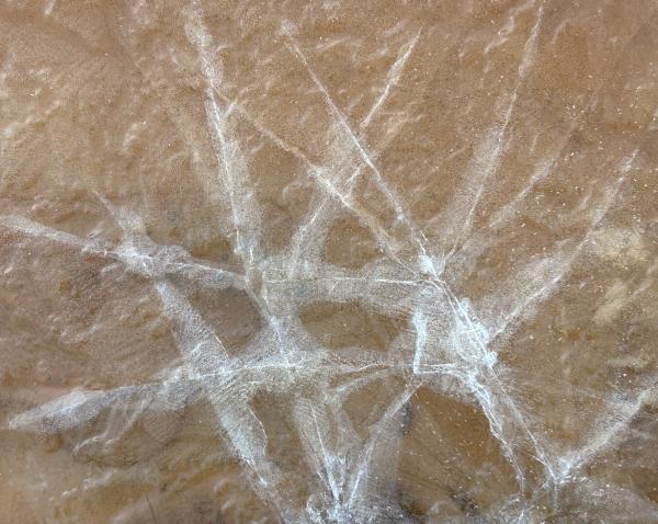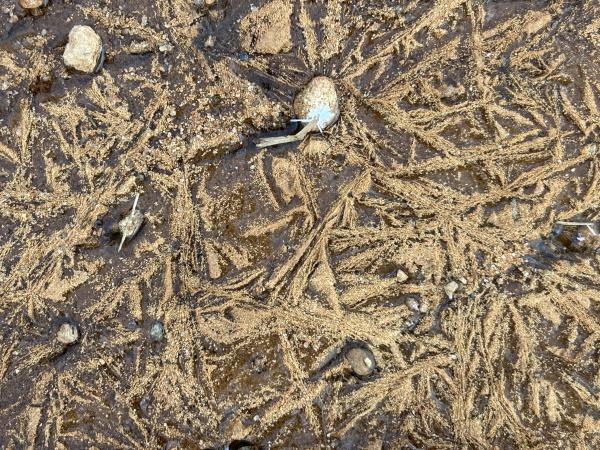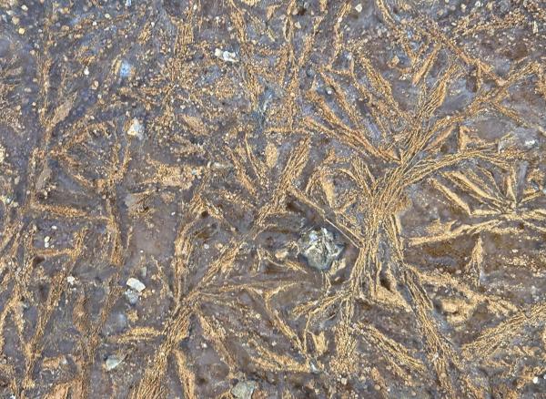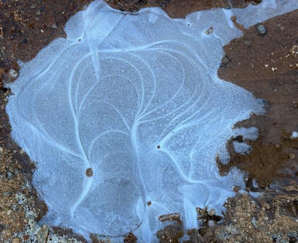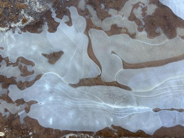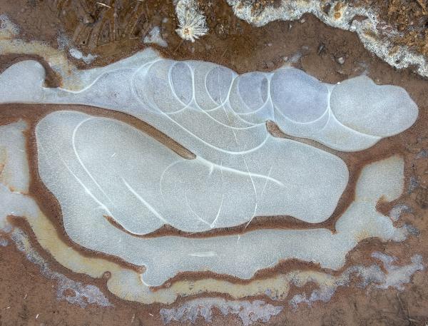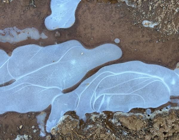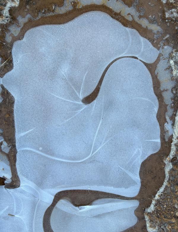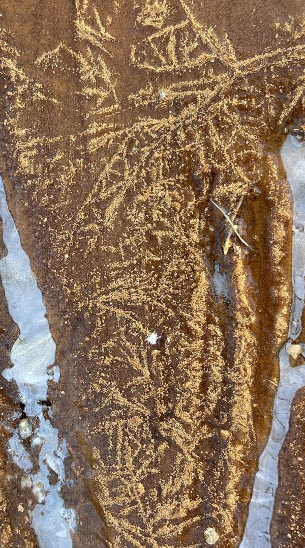 1、红水成冰花 换条路走,在小糖溪西侧。从春到秋,它长满了野草,偶有工程车驶过。也有遛狗的人,在这里让狗狗自由行走。倒是鹿落个清静,站在坡上凝视着我们,晨光落在身上,如金花。 快到路尽头,车辙深处,积水成冰。惊喜地发现,是红水,弯弯,圆圆,成远古初民的图画。我在拉斯维加斯附近的红岩山看过,笔法粗壮,拙朴,呼吸之间,色深色浅。而眼下,红土地的水被冰封后,晶莹华润。 不远处,车辙印成了干花,棕红色也多了几分干硬。 后来在别处见到了几块冰,也是许多花样,但冰下是白色的水,虽纯净,却少了那份血色般的深沉。我踩碎了一块,咔嚓一声,裂痕从一个中心,伸向四处,宛如宇宙大爆炸。