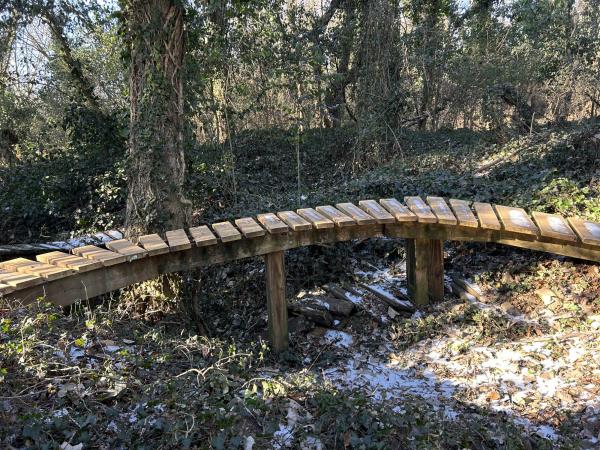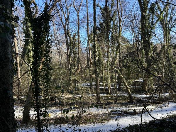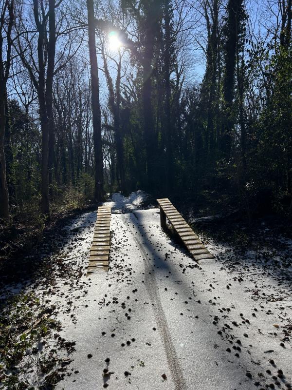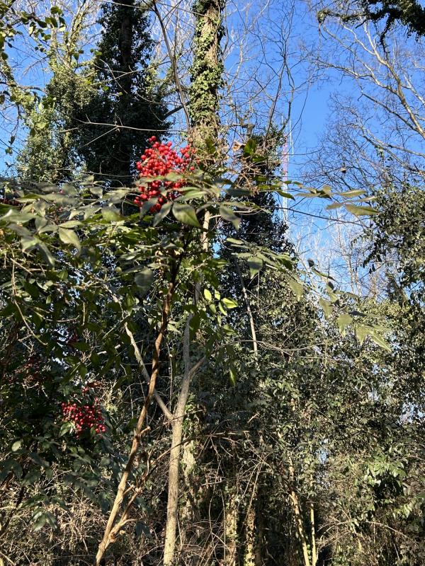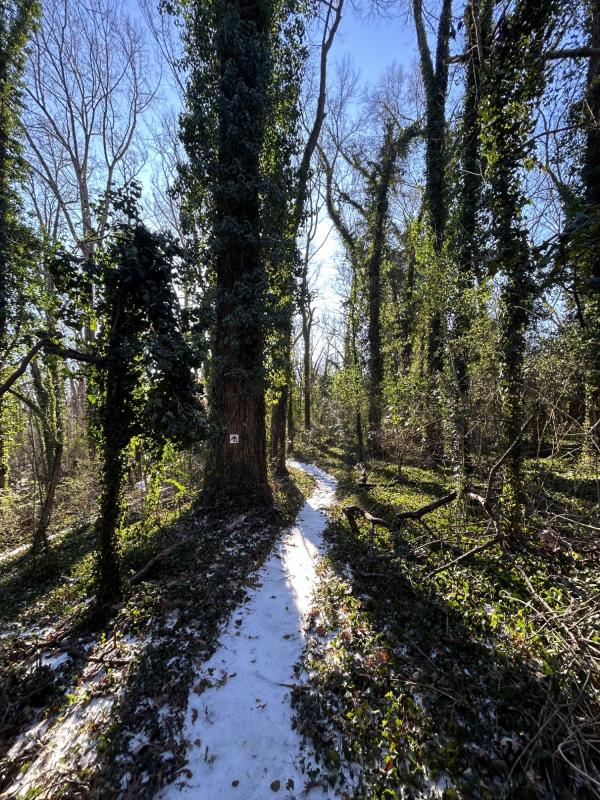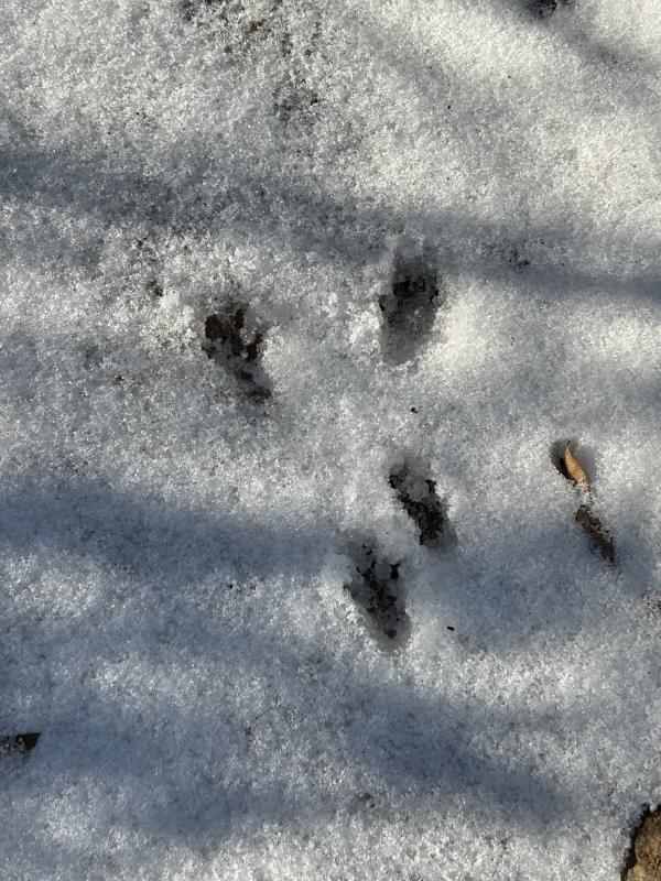 2、小山丘奇遇 又进了小山丘。行前还查了一下,它无姓,无名。山不大,高不过四五米,一条山间小路,是为徒步者与骑自行车的人修的,不过一尺多宽。顺着大树的缝隙回转,从东到西,由南至北,也都不过两百来米,但绕得我走了一个多小时。 与两天前相比,小路上的积雪化了一些,路有点滑,不过,走在路旁的落叶上,比地毯还舒服。山未空,泊尔常春藤缠绕大树 ,绿意登天,红果几株,色彩迷人。一只红鸟,忽前忽后。奇了,怎么不见小松鼠的身影。一簇蘑菇头,是人查在树桩上的玩具。另一个是棕色的小狗,爪子抱住了树枝。 惊喜地发现,一道自行车的车轮印。它居然还冲上了几尺高的障碍板桥——好勇敢。一双鞋印,看来是成年人。动物的脚印很奇怪,四个叉,挺大的,是什么呢? 传来人语声,男低音,断断续续。怎么也没看到人影。再抬头时,远处一根红白两色的铁杆,是指示灯吗?确定,这是路尽头,小丘最高处。 哇,两只手套都不见了。顺原路回头找,十多分钟过去,还是不见踪影。情急,用英文呼求:“Lord ,help me!”话音落后不到十几秒,我也就是走出了三五步,前方右侧,那哥俩躺在地上。 是的,不祈祷也会找到。但高兴的是我祈求了,也发现了。那句古老的话语在小丘深处低音,你们祈求,就给你们…… 2026.1.27 记事