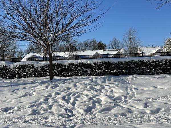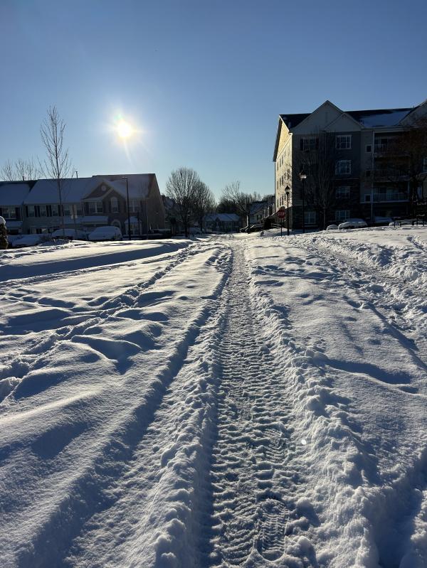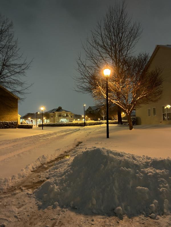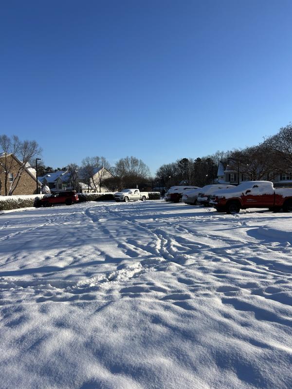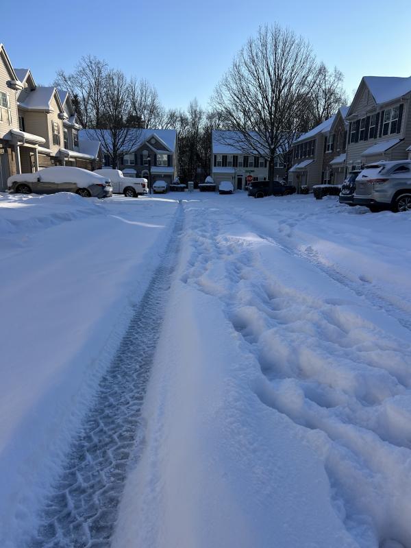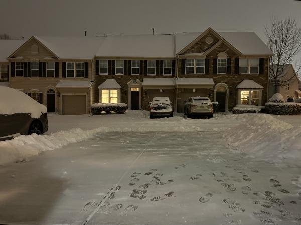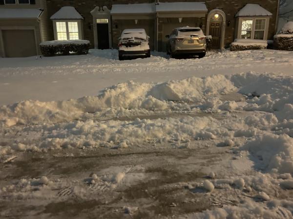 夜里十点多,雪停了。听说这是夏洛特地区二十年一遇的大雪,一百五十年的气象记录中,排进前四。这机会竟让我遇到了,真幸福。 从小就铲雪,这两年没干过,手艺活都生疏了。 在车库里找了半天,不见一把铁锨。摇头,在芝加哥时那么多的铲雪工具,伴了我那么多年,竟一把也没带来,老范啊,老范,你好无情啊。并且还——蠢。 终于找到一块塑料挡板,宽不过一尺,长,还不到一条胳膊。将就吧,聊胜于无。 不见一人。哈哈,我竟干起了见不得人的活。也是,至少铲雪工具见不得人。 站在车道前,好痛快。夜色沉静,路灯昏暗,凉气凛冽。用从来没用过的姿势开干:深深地弯腰,把雪推到边上后,像端簸箕一样向上扬,扔掉。 不过十分钟,腰酸了。停下来喘口气的功夫,看看两侧,道上、草坪上全被雪盖上了。人行道,两行大脚印,深而又深。用双脚核实,没过脚脖子了。听说今天积雪十几英寸,此言不虚。 歇过劲来,继续铲。告诉自己,老了,慢点干,夜很长,干活的人,梦不多。 门前的雪清理完毕。顺势,把人行道的雪也清理出一段,免得有人会滑倒。清了一阵子后笑了,这么晚,谁会出来走步啊。左邻右舍,清雪的,只有我傻瓜一枚。若在芝加哥,此时铲雪机早已轰鸣。 把滑板插进雪堆里,拍照留念。估计,这会成为铲雪的独门武器。果然,第二日中午借给邻居用时,他连声叫绝。我心生暗喜,德不孤必有邻。 2026.1.31