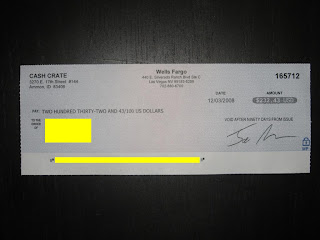新手注意: 如果你还没有看过:新的免费挣钱方法尝试----挣小钱!( 一) 请[点击下面的链接进入]先看一遍! http://blog.creaders.net/chestnut86/user_blog_diary.php?did=38833 ------------------- 新手请先点下面我的推荐这个链接到网站注册 (免费) http://cashcrate.com/1299371  ----------------------------------- 新的免费挣钱方法尝试----挣小钱!( 三) ----------------------------------- 支票真的会寄来吗? 有网友问我是否收到了网站寄来的支票。 我通过在网上搜索,发现这个网站的可信度还是挺高的: 1.各种搜索引擎的搜索结果很多,也很正面;YouTub上的搜索结果也很多。 2.网站从2006年开始支付会员酬劳,会员展示的支票比较多,而且网站取消了更易产生纠纷的Paypal支付模式,完全使用支票和直接划账。 看看这两张会员收到的支票的图片: 图片(1):(点击这里看大图)  图片(2):(点击这里看大图)  3.美国是一个法治的国家,如果真有拖欠这种“小钱”的行为,公司或网站不可能平安无事地经营数年,一旦被人指诉欺诈,动不动就会倾家荡产。而这位经营者“乔”JOE 处处直接留名、签名,可见其守法经营。 这里有一个窍门,可以留下你工作的全部的证据,即便有问题也很能作为证据,就算是争执到小额法庭,也能小赚一笔:网站上击点“My Account” 进入自己的帐号设定页面。(点击这里看大图) 这里顺便也看到了我截止到今天的工作成果:总计收入$48.30,挂起审查$19.35,外加17个点数,目前还没搞清点数是干什么用的。嘻嘻。(点击这里看大图) 随后在设定页面左下角打上这个勾,以后每做完一个调查表并通过审查,网站的JOE就会给你发一封详细的电子邮件确认,这邮件留着就踏实多了。 --------------------------------- 支票、支票,还是支票与最小付款额的问题 正像下面图片显示的那样,大家可以尝试按图片上显示的“My Account”,进入帐号设定,其中可以更改最小付款额的具体数值并且按“Update”键刷新。据说可以自由设定,但不能低于$20元。(点击这里看大图)  我一开始也担心过这个$20元的限额,觉得它不太合理,但后来查清楚了,无论你做的多慢,你挣的钱是不会清零的,总能超过这个限额。估计网站经营者一来考虑支票成本(加邮费应该在$1到$1.5之间),二来也不希望你浅尝辄止,中途退出。这也就解释了为什么挣到$10的时候会有奖励的原因!你现在挣到的是否超过$10元了?加把劲,别放弃,很快就能到$20,我亲身体验过的,就两三天的时间!等过了$20元的限制,你再去考虑是否坚持下去或是放弃这类问题,因为那时你无论如何都能收到支票,不会白做工了! 从论坛与网络上搜索到的消息表明,该公司每月支付数千张支票,支票似乎是由第三方打印并寄出。每月的支票,普通会员的将从下一个月的15号开始打印,等到寄出和收到,估计还要多加时间。该网站还特别提醒,支票是打印撕开型,千万别当垃圾邮件扔了,下面就是支票邮件的正反面图。(点击这里看大图)  (点击这里看大图)  先来看看,这是易撕型的三页邮寄支票,算是中档的寄支票的方法,低档的干脆就是一张单页纸,什么都是公开的。支票平信寄出,把地址和地址条码覆盖了,(点击这里看大图) --- 信封  信封上有CASHCRATE公司的详细地址:3270E. 17th Street #144 Ammon, ID 83406 公司在艾达荷州,加州的东北部,盛产土豆。再来看看信封撕开的样子,支票已经撕下来,适当遮挡了个人信息。(点击这里看大图)  再来看看支票:WellsFargo银行,信誉没问题。钱数:$232.43;签转日期12月3号,看来公司付款效率还挺高。顺便回答大陆博友关心的几个问题: 1.中国银行可以兑换这种支票,但要收手续费; 2.支票上姓名前没有MR之类先生小姐等称谓; 3.支票上既有姓名也有地址; 4.支票的兑现期为90天,有水印,可背书;(点击这里看大图)  看到支票,我想大家都松了口气,毕竟大家最关注的 实实在在的网络挣钱的机会得到了印证!看来做这件事,创这个博客都是非常值得的!估计大家的支票也会陆续寄到,相信大家可以从此放下心来,大胆地大干了! ----------------------------- 4月的支票,总额$99.08元。(点击这里看大图)  立即打开CASHCRATE网站工作 http://cashcrate.com/1299371  本贴正在新建中....内容在不断增加.....敬请关注......谢谢......... 有具体问题,欢迎直接在本帖子上发表评论,我会回答并贴出..大家一起来讨论,并推荐你的朋友也来一起挣小钱! |