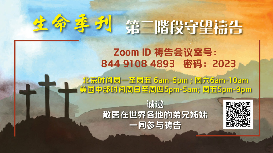 請點擊參加禱告👇: 為教會復興守望禱告(Zoom) 守望禱告時間: 北京時間 周一至周五: 早上六點開始,晚上六點結束 每天禱告12個小時 周六:早上6點-上午10點 美國中部時間 主日至周四: 每天晚5點開始,次日清晨5點結束 周五:晚5點至9點 請轉發守望禱告Zoom鏈接👇: https://us06web.zoom.us/j/84491084893?pwd=VTFaWkRMRk5kZ3pYOVkwWGU5eXFkQT09