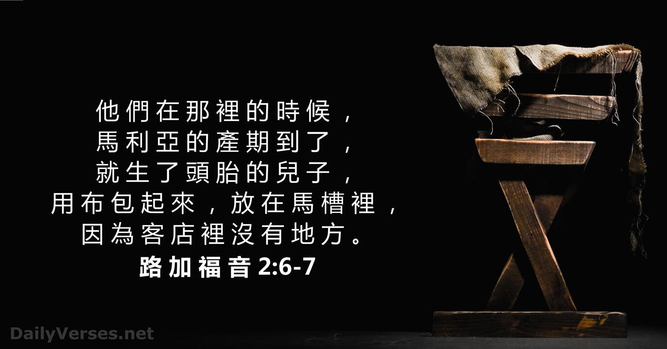 今日經文:“他們在那裡的時候,馬利亞的產期到了。就生了頭胎的兒子,用布包起來,放在馬槽里,因為客店裡沒有地方。”(路加福音2:6-7)