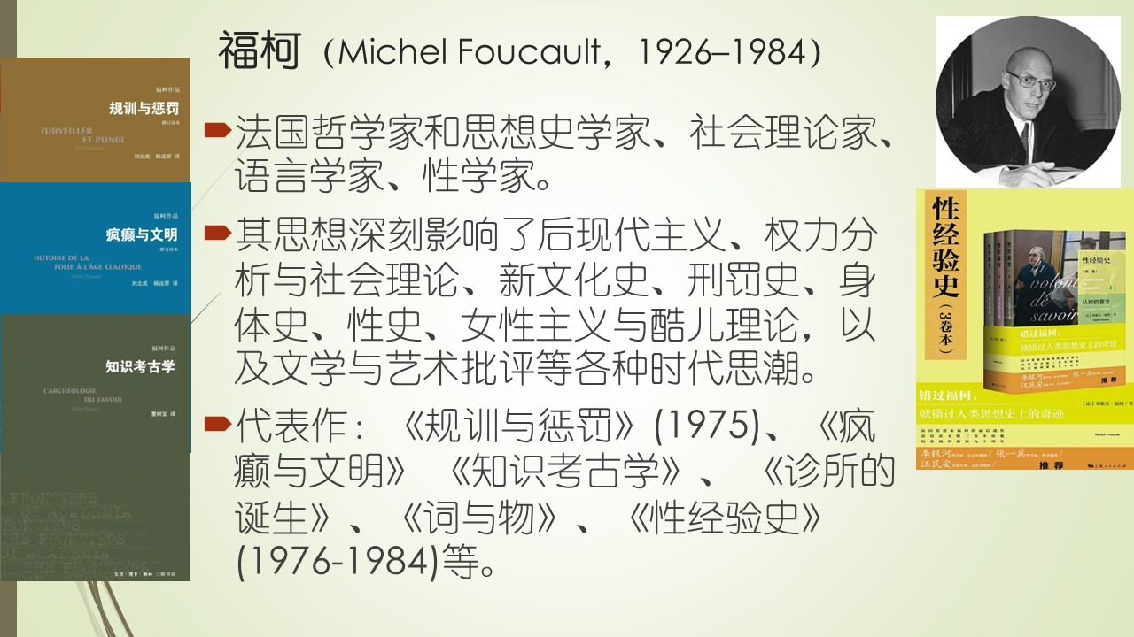福柯: 强调知识与权力关系的建构 福柯(Foucault,1926–1984):法国哲学家和思想史学家、社会理论家、语言学家、性学家。他的思想深刻影响了后现代主义,他对知识与权力的分析,包括对社会理论、新文化史、刑罚史、身体史、性史、女性主义与酷儿理论,以及文学与艺术批评等各种时代思潮都有巨大的破坏作用。不仅写了许多书影响世人,如其代表作:《规训与惩罚》(1975)、《疯癫与文明》、《知识考古学》、《诊所的诞生》、《词与物》、《性经验史》(1976-1984)等。他还身体力行,是一位同性恋者,在50多岁时终于死于艾滋病。他花了8年的时间写他最后那本书——《性经验史》,写了三卷,一直到他死都没有写完。还好没有完成,否则对人类的危害更大,这部书为后面的性解放、性开放、LGBTQ奠定了理论基础。