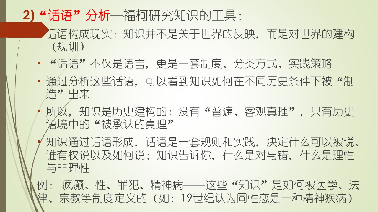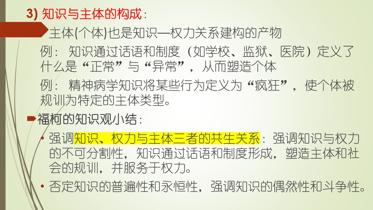 在福柯来看,“话语”不仅是语言,更是一套制度、分类方式、实践策略,通过分析这些话语,可以看到知识如何在不同历史条件下被“制造”出来。所以,知识是历史建构的,没有所谓的“普遍、客观真理”,只有历史语境中的“被承认的真理”。福柯主张知识是通过话语形成,话语有一套规则和实践,决定什么可以被说、谁有权说以及如何说;知识告诉你,什么是对与错,什么是理性与非理性等。 语言是一套规则、一套制度,一种分类的方法,通过分析语言,我们知道这个历史和真理,是在这个语境当中被造出来的,被建构出来的。比如你说知识,怎样决定你说的是可以被说的,不可以被说的,什么是对的,什么是错的,都是权力来决定的。 例如,福柯大量研究了疯癫、性、罪犯、精神病这些“知识”,来证明这些知识是如何被医学、法律、宗教等制度定义的。最后他自己死于这个性病。他说十九世纪认为同性恋是一个精神疾病,他预言到了二十世纪,同性恋再也不是一个精神疾病了。非常不幸地是被他预言中了,现在不仅同性恋被认为是完全正常的,甚至变性等匪夷所思的的罪恶,人们都视而不见。 福柯知识观核心的第三点——知识与主体(个体)的构成。他认为主体也是知识——权力关系建构的产物。打一个比方,知识通过话语和制度(如学校、监狱、医院等)定义了什么是“正常”,什么是“异常”。一个人一旦被定义为“异常”,他这个个体就被社会或制度塑造成为“异常”了。福柯看到了很多罪犯、疯癫的人,他认为这是社会给他们的社会定义,通过权力定义了他们是疯癫的、是性犯罪的,是社会建构了他们的“异常”。
