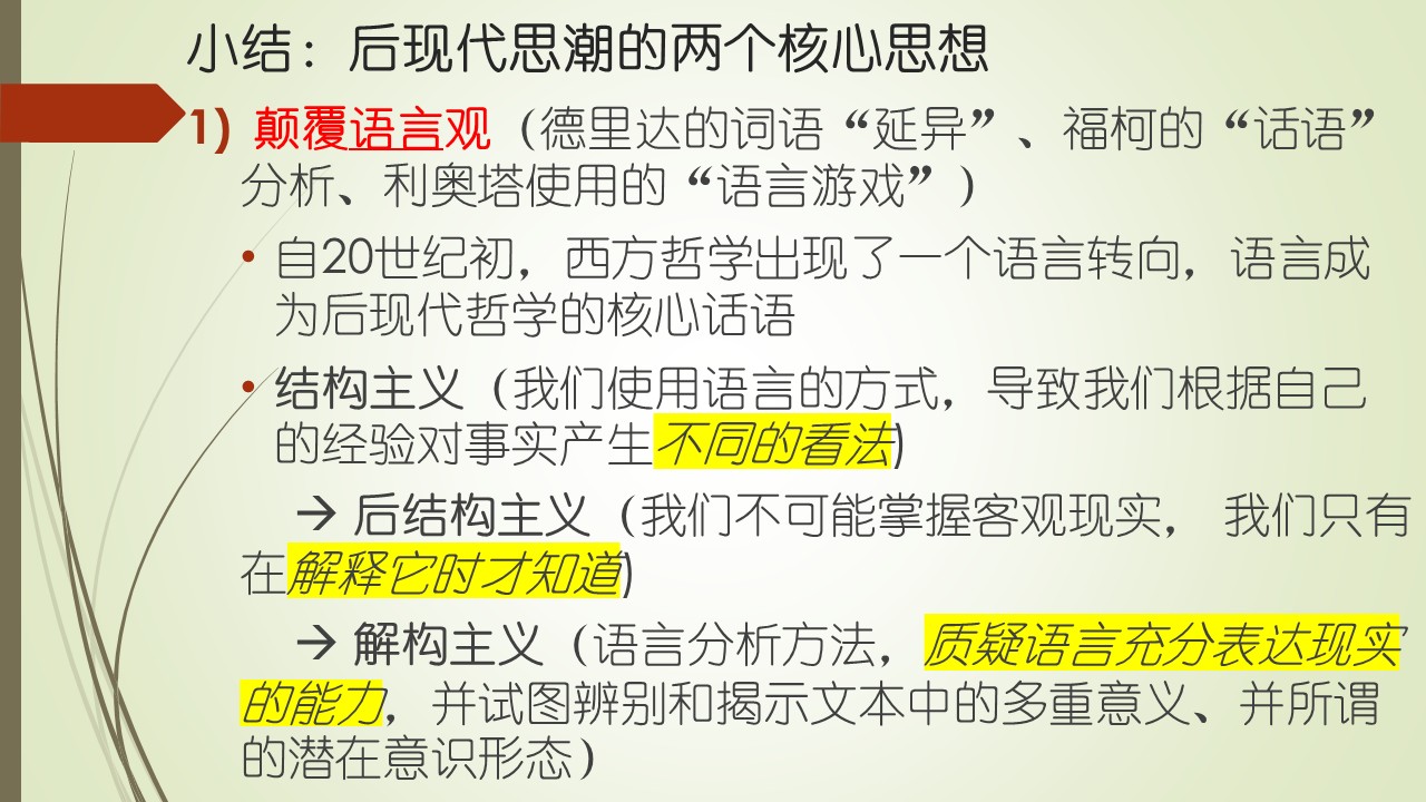 福柯的知识观小结:1)强调知识、权力与主体三者的共生关系,强调知识与权力的不可分割性,知识通过话语和制度形成,塑造主体和社会的规训,并服务于权力。2)否定知识的普遍性和永恒性,强调知识的偶然性和斗争性。 小结: 后现代思潮的两个核心思想 现在,让我们小结后现代思潮的两个核心思想。第一个核心思想要颠覆语言观。无论是德里达的词语“延异”、福柯的“话语”分析、利奥塔使用的“语言游戏”,都是要颠覆传统的语言观。自20世纪初,西方哲学出现了一个语言转向,语言成为后现代哲学的核心话语。