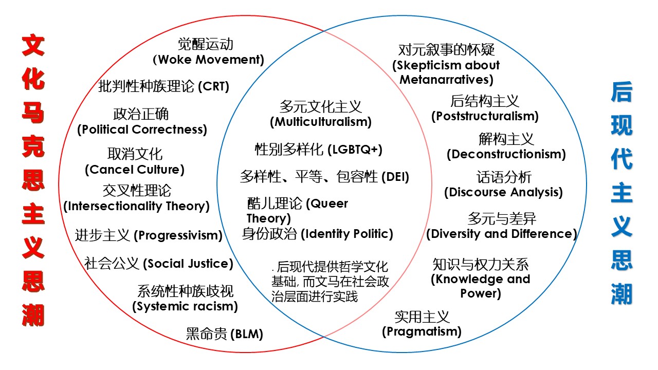 我们简单对比一下结构主义、后结构主义与解构主义的语言观。结构主义说,我们使用语言的方式,导致我们根据自己的经验对事实产生不同的看法。我们每一个人都把他自己的经验、以及看到的事实所产生不同的看法。这个被称为结构主义。后结构主义说,我们不可能掌握客观现实,我们只有在解释它时才知道。不是有客观存在的一个意义,而是当我们解释它的时候,这个意义才出现了,这是后结构主义。而解构主义的语言分析方法说,质疑语言充分表达现实的能力,并试图辨别和揭示文本中的多重意义、并所谓的潜在意识形态。 例如,法国哲学家和符号学家罗兰·巴特,宣布“作者已死”,将文本阐释权完全交给读者。表达现实、真理的知识被符号化、信息化、商品化之后,知识和真理就失去了客观性。今天信息的传播靠媒体运作,媒体本身受到政治、经济、文化和商业众多因素影响而失去客观性。比如说现在的主流媒体,靠那些大科技公司、大数据公司来掌握的,受到政治、经济、文化各个方面的影响,已逐渐失去了客观性和公允性。 第二个核心思想是对元叙事的怀疑。后现代主义否认本体论,反普遍真理,反客观事实,拒绝认为存在适用于所有人群和文化的终极解释。解构了传统逻各斯中心主义、本质性、整体性、确定性、统一性,反权威、反理性,强调非中心、差异性、多元化以及不确定性,所有这些通通都解构掉了。 所以,无论是解构语言,还是解构元叙事,最终,都指向了权力。解构了语言就掌握了话语的权力,解构了元叙事就掌握了知识的权力。后现代主义用解构掌握权力,文化马克思主义最后也是要权力,只不过他们是用群体分类来掌握话语权,用道德绑架来夺取文化知识霸权。