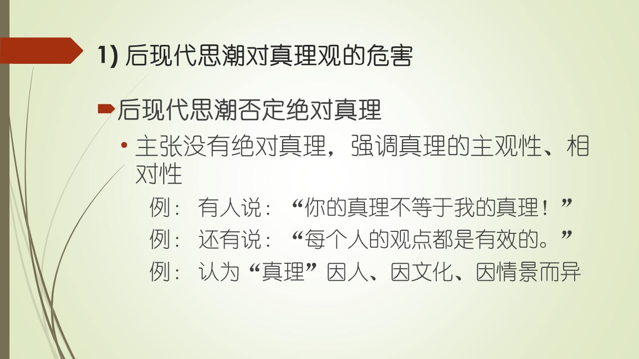后现代主义对教会的危害 下面,我们从四个方面来看后现代主义思潮对教会的危害: 1)对真理观的危害(本体论/认识论方面) 2)对权威的怀疑与解构的危害(认识论方面) 3)对道德观的危害(伦理学方面) 4)对信仰实践的危害(实践方面) 第一个方面,是对真理观的危害,就是对基督信仰本体论、认识论的危害。后现代思潮否定绝对真理,主张没有绝对真理,强调真理的主观性、相对性。例如,我们常听有人说:“你的真理不等于我的真理!”还有人说:“每个人的观点都是有效的。”后现代主义认为“真理”因人、因文化、因情景而异。于是,后现代主义质疑圣经的绝对权威,将圣经只是视为“一种叙事”,而非“唯一真理”,否认圣经叙事的独特性。耶稣基督的救赎可能被解读为一种象征性的“个人启发”,而非救赎历史事实。使得基督教信仰的核心被相对化,造成基督教教义的被模糊、妥协、歪曲、滥用。
