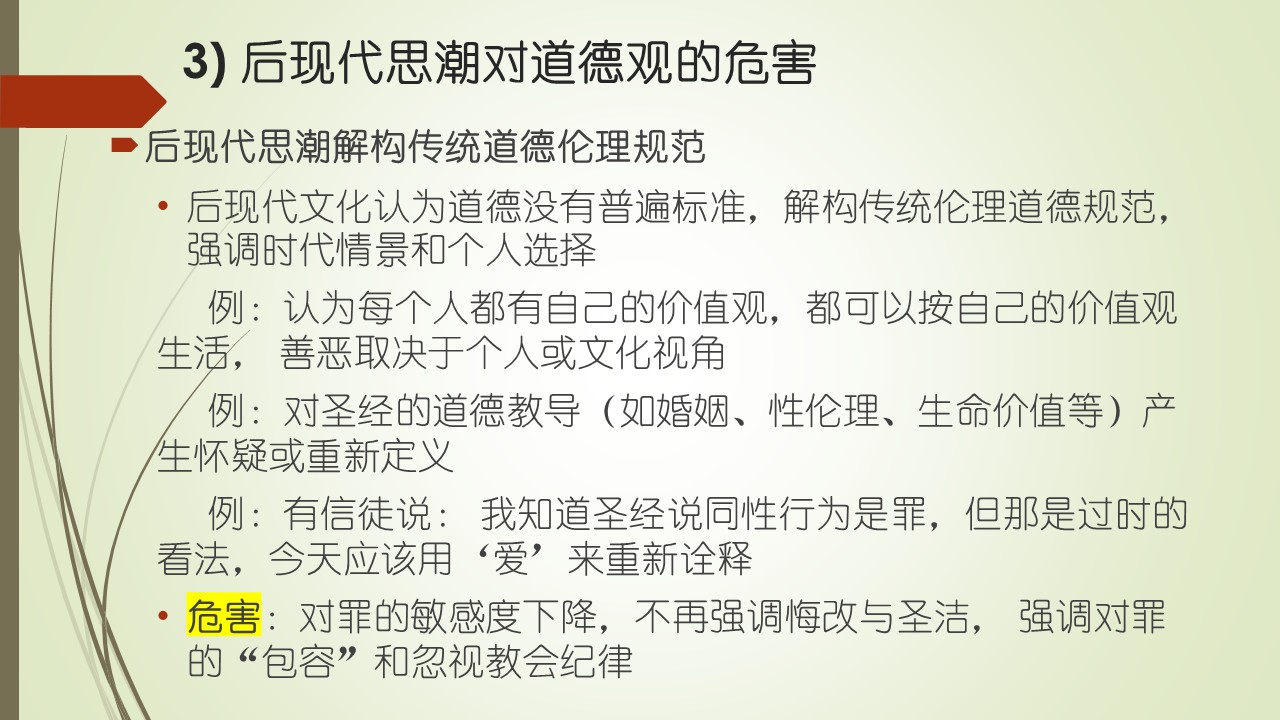 其次,相信基督教教会的传统教义和教会领袖的属灵权柄,不受后现代反权威思潮影响。圣经教导:“坚守所教真实的道理,就能将纯正的教训劝化人,又能把争辩的人驳倒了。”(提多书1:9)希伯来书13:17节:“你们要依从那些引导你们的,且要顺服;因他们为你们的灵魂时刻警醒,好像那将来交账的人。你们要使他们交的时候有喜乐,不致忧愁。” 第三个方面,是对道德观的危害,后现代思潮解构传统道德伦理规范。后现代主义文化认为道德没有普遍标准,解构传统伦理道德规范,强调时代情景和个人选择。例如,认为每个人都有自己的价值观,都可以按自己的价值观生活,善恶取决于个人或文化视角。因此,对圣经的道德教导(如婚姻、性伦理、生命价值等)产生怀疑或重新定义。例如,常听有人在教会说,我知道圣经说同性行为是罪,但那是过时的看法,今天应该用“爱”来重新诠释一切。致使对罪的敏感度下降,不再强调悔改与圣洁,强调对罪的“包容”远大于对罪的憎恶。