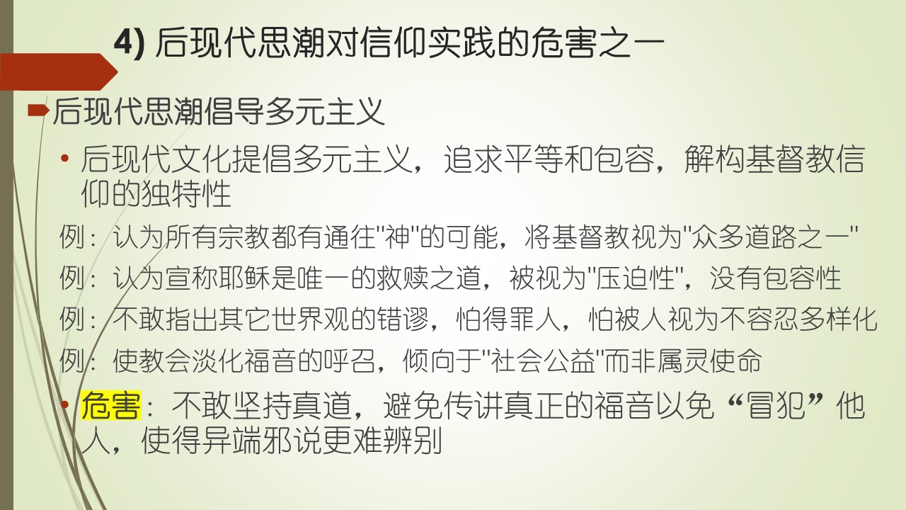 第四个方面,是对信仰实践的危害。后现代思潮倡导多元主义,追求平等和包容,解构基督教信仰的独特性。例如,认为所有宗教都有通往“神”的可能,将基督教信仰视为“众多道路之一”。又如,认为宣称耶稣是唯一的救赎之道,被视为“压迫性”,没有包容性。再有,不敢指出其它世界观的错谬,怕得罪人,怕被人视为不容忍多样化。致使教会淡化大使命的福音呼召,倾向于“社会公益”而非属灵使命。不敢坚持真道,避免传讲真正的福音以免“冒犯”他人,使得异端邪说更难辨别。