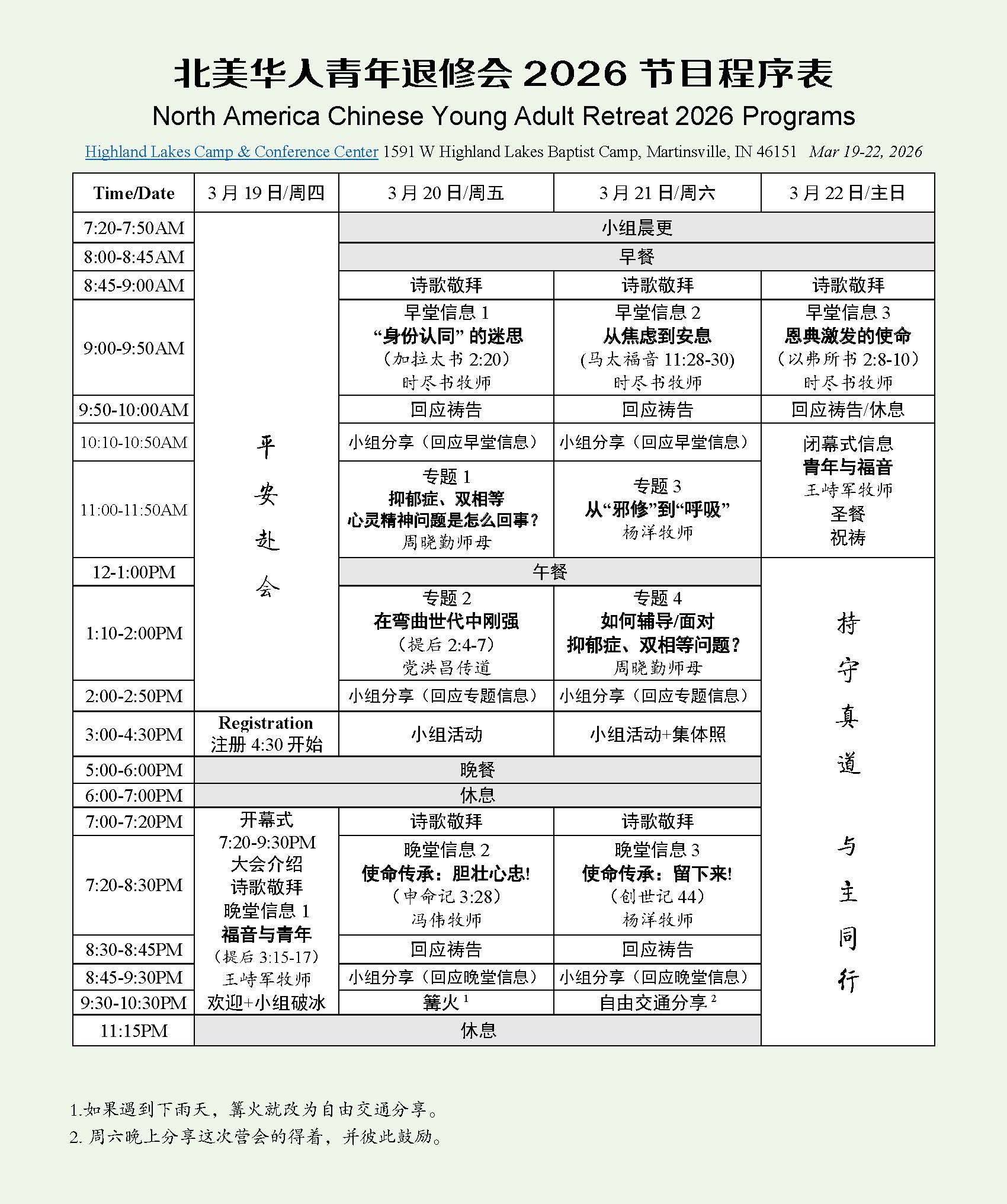 如何报名出席 “北美华人青年退修会2026” 退修会网上报名: https://web.cclife.org/nacyr2026 欢迎各教会大学生、研究生、职场青年及校园福音事工传道人/职青事工辅导同工参加。报名截止日期为:3月5日;退修会营地名额有限,先到先得;敬请抓紧时间报名。 时间: 2026年3月19-22日 (周四晚至主日中午,全程提供幼儿看顾) 地点: Highland Lakes Camp & Conference Center 1591 W Highland Lakes Baptist Camp, Martinsville, IN 46151 (离印城机场约25分钟车程,请订机票到 Indianapolis International Airport;机场 Code IND。请电邮您的航班信息至:cclifefl@gmail.com) 下载青年退修会海报PDF版: 北美青年退修会海报 下载青年退修会节目PDF版: 北美青年退修会节目表 |