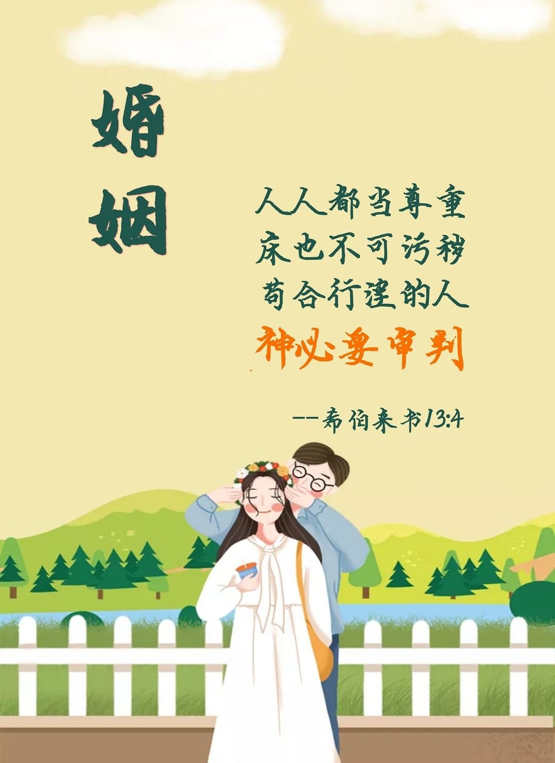 當摩西違背了神的指示,並沒有在會眾眼前吩咐磐石發出水來,反而用杖擊打磐石兩次使水流出來,沒有在神的子民眼前尊耶和華為聖,這是不順從神的表現。聖經記載耶和華對摩西和亞倫說:“…因為你們不信我,不在以色列人眼前尊我為聖,所以你們必不得領這會眾進我所賜給他們的地去。”(民20:12)這提醒我們,是否凡事都以神所悅納的心態來事奉這位聖潔的神。 在今天的經文中,在婚姻的大前提下,從“合一”的觀點來看,有七個應用。其中包括“同負一軛”;“一生一世”;“一夫一妻”和“一男一女”。 正如開頭所提到的,聖潔的婚姻建立在雙方對愛、順服/敬重,和聖潔的承諾。對於那些正準備步入婚姻或已經結婚的人,請留意這些關鍵方面。 “婚姻,人人都當尊重,床也不可污穢;因為苟合行淫的人,神必要審判。”(來13:4)