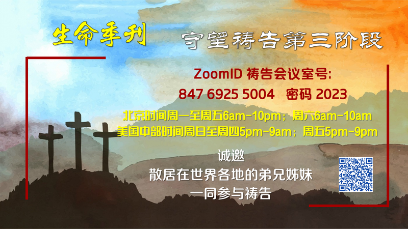 请点击参加祷告👇: 为教会复兴守望祷告(Zoom) 守望祷告时间: 北京时间 周一至周五: 早上六点开始,晚上10点结束 每天祷告16个小时 周六:早上6点-上午10点 美国中部时间(夏令时) 主日至周四: 每天晚5点开始,次日清晨9点结束 周五:晚5点至9点 请转发守望祷告Zoom链接👇: https://us02web.zoom.us/j/84769255004?pwd=OStVZU5BWSt4dXVHb2ZLMFFQbGxqQT09