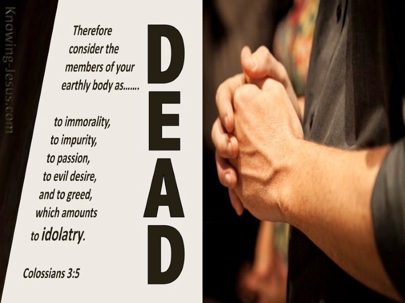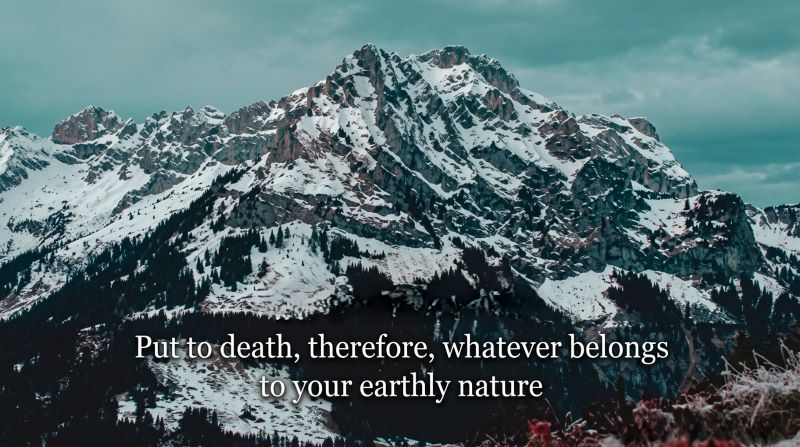 “(要)治死”Νεκρώσατε:νεκρόω的不定过去式主动态命令语气第二人称复数):把……置于死地。“要治死”是一个命令。为着能够真正“思念上面的事”,就必须“治死”地上的肢体。只要这些“肢体”还活着,人所能思念的就只有“地上的事”。同样,当人“思念上面的事”的时候,才能从“上面”(那里有基督在神的右边),得着“治死”地上的肢体的力量。人自己没有办法“治死”自己“在地上的肢体”。这工作惟有圣灵借十字架来完成。