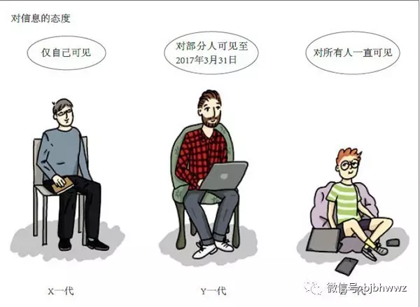 个人信息 X一代认为个人信息是非常隐私的东西。当他们发现个人信息被公开时会感到非常不安。他们在使用电脑和互联网时总是小心翼翼,在这点上他们和美国婴儿潮那代人(1946-1964)一样。 Y一代对信息的态度则截然相反。他们认为交换信息是生活的重要组成部分、一味的保护个人信息不可取,信息交流得越多就越感到对方可靠,他们也十分关心数据的保存。这代人对信息有如下原则:我会为你共享文件夹,然后在需要时你也要为我这样做。 Z一代非常信任密码和电子钥匙,个人信息非常公开,但与此同时他们也非常注重不想被人看到的个人隐私:害怕手机被人解锁,担心照片和文件被人看到。