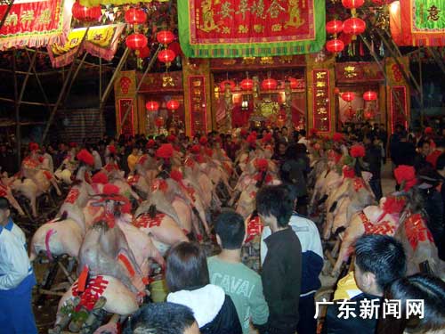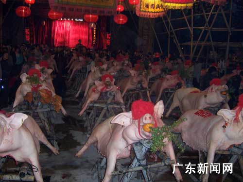 今天是广东汕头鸥汀街道十年一度庆灯首的传统日子,从二十六日晚开始,该村已摆开“赛猪大阵”,全村到处张灯结彩、鼓乐喧天,大街小巷都沉浸在喜气洋洋之中。