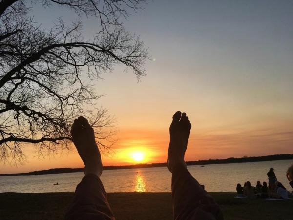 进入三月中旬,有太阳的日子是很惬意的。 气温不冷不热。湖边有微风吹来, 让人心旷神怡。远处望去,夕阳的余晖浸润了对岸树林的上空。 太阳已失去午正时的威力,在我的眼帘里微微地晃动着,像是挣扎着要取回失去的光芒。 我眨了眨眼睛,有点不敢相信,太阳竟然会这样波动,这让我感动。 也许,这不过是空气振荡造成的视觉效果? 不管怎样,全能的造物主是配得赞美的,因为这一切太奇妙,太舒心了。 周围是三、五成群的人们,或是坐在石凳上,或是摊开垫布,席地而坐。 有带野餐的,吃着,喝着; 有人随着吉他悠悠地唱着歌; 有拍照的,总以落日为背景; 更多的人是在窃窃私语,和家人、朋友说心里话呢。 忽然间,哪里传来一声“shut up!",高过任何其他声音,是唯一能听清楚的。呵呵,人间的不和谐也会被带进当下片刻的平静之中。。。 一天最后的时刻,变的宝贵起来,大家好像唯恐来不及欣赏它,赶在它消失前聚在一个平时很少见到人的去处。 我找了一处斜坡,赤脚躺下。 双手枕起头,刚好看见湖面,有人驾着游艇穿来穿去。 徐徐下落的太阳在湖那边快接近地平线了。 我掏出手机,想拍下落日的最后一刻,却发现自己两只赤脚成Y型,好像要接住那个圆球,不让它再落下去。