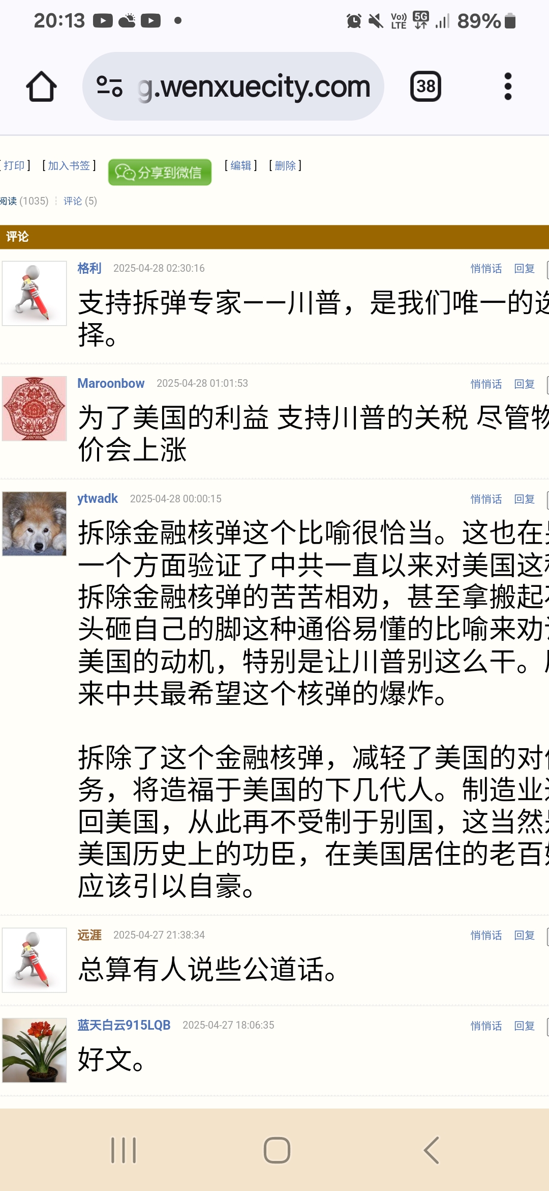 脱掉你们的有色眼镜: 世纪金融核弹还未被引爆,川普不是引爆核弹, 而是在用自己的老命为美国拆除核弹! 作者: 草头大将军, 仁义勇公子 一篇令人惊悚的博文【川普提前引爆世纪核弹,美国走向何方,....】在作者用标题党的方式,让他的博文在万维提前引爆,成为【万维24小时点击最高】的榜单第一名。 然而,事实果真如此吗?答案是否定的 美国的金融核弹真的已经被引爆了吗?答案是否定的。 核弹真的是被川普引爆的吗?答案也是否定的。 核弹真的是被提前引爆的吗?答案更加是否定的。 一个根本不存在的事实,居然被博主作为标题用来吸引读者眼球,这就是不折不扣的标题党行为。 虽然博文作者并没有用这篇博文来谋财但是他的这篇博文达到了害命的结果, 该文作者你知道吗?全球有多少人患上了川普恐惧症吗?在这些人群中,即使只有一小部分被你告知川普提前引爆了世纪核弹,至少也会有上百万人因为惊恐而心脏病发作而提前丢掉他们的小命或者老命。 作为一个负责任的博主, 你可以没有水平,但你不能没有良知。 你可以没有智慧,但你不能没有底线。 你可以搏命出位,但你不能歪曲事实。 让我们拨开迷雾,还原事实: 在危机来临时,总有挺身而出的英雄勇敢直面挑战,也总有一些懦夫躲在角落里哭喊“完了完了”,把责任推给那些真正敢于出手的人。最近,一篇题为《川普提前引爆世纪核弹,美国将走向何方....》的博文,恰恰就是后一种懦夫的典型哀嚎。 可惜,哭喊不能拯救美国,只有清醒与行动才能才是唯一可行办法。因此,我们有必要拨开迷雾,看看事实真像到底如何? 1. 世纪核弹美债危机是谁种下的?不是川普! 博文一开头就惊呼:美债已达36万亿,是世纪核弹!——很好,事实确实如此。 可是,这颗核弹是谁几十年亲手打造的呢? 1,从老布什到克林顿到小布什到奥巴马,哪一届没有疯狂举债? 2,甚至奥巴马时期,仅仅8年就把美国国债翻了近一倍! 3,拜登在白宫仅仅呆了四年, 国债就再增加了10万亿。 而川普上台后,第一次真正提出了“缩表”“加息”“削减联邦开支”“收紧全球化脱实向虚”的口号。 讽刺的是,制造核弹的人被原谅了,试图拆核弹的人反倒被指责为引爆核弹? 这种逻辑,简直可以申请世界最滑稽大奖了。 2. 川普关税政策是拯救,不是引爆! 原文大谈高关税是“自残”,是“提前引爆核弹”。——笑话! 美国每年几千亿的贸易逆差,难道靠继续“佛系全球化”能解决? 有人将川普的高关税比作“引爆核弹”,这完全是颠倒黑白。 事实是: 1,美国每年对华贸易逆差高达3000亿到4000亿美元; 2,对欧盟、日本、墨西哥等国的逆差也巨大; 3,这些国家靠“出口创汇”,反过来持有美国国债,使美国进一步被动负债。 川普高关税的本质,是迫使贸易伙伴真正开放市场、减少对美逆差,而不是让美国更快破产。 没有贸易逆差的流血,就不会有债台高筑的今天。 而那些坐享对美贸易顺差,长期占美国便宜的国家,本来就该为过去几十年的失衡“还账”。 想靠“裁减联邦开支”来堵赤字,当然必要,但那是漫长而困难的内部斗争,川普同时用关税创造外部压力,才是现实主义的双线作战。 所以川普必须 1,削减逆差,减缓资本流出; 2,促使制造业回流,恢复实体经济; 3,用贸易收入部分抵消财政缺口。 难道在船已经破了大洞、在不断进水时,不去堵洞,反而继续像民主党那样做一艘破船上歌舞升平才是“聪明”吗? 关税就是堵洞,虽然痛苦而且困难,但能延缓美国这艘航母沉没! 只有幼稚派经济学家才幻想着靠“自由贸易神话”自我修复,美国工人和制造业早已用破产潮、失业潮、去工业化告诉你:神话破灭了。 3. 川普找钱,是在救火,不是“铤而走险”! 原文嘲笑川普想通过各种方式“找大钱”,比如关税、资源外交、强化军费谈判。 好像国家财政出现万亿缺口,就可以靠“节约政府办公用品”解决似的? 醒醒吧!当财政每年破2万亿赤字的时候,要补洞,当然要大手笔! 川普砍掉非法移民福利、要求北约盟国分担军费、对贸易顺差国征税,这些都是理性止血之举。 真正铤而走险的,是那些要 继续靠印钞、滥发债让美国国债成为核弹的人, 继续盗窃美国纳税人钱的人, 继续用死人领取社会福利金的人, 继续利用美国国际开发署洗钱最终回流到民主党手中的人, 继续骗自己还能过十年二十年的这些美国的蛀虫。 讲真的,救美国,靠温良恭俭让的政治正确,是绝对不可能救回来的。 4. 川普不懂经济?事实证明他比所谓专家清醒多了! 原文冷嘲热讽说川普是地产商,不懂经济金融科技。 嗯,请问: 1,是谁在八十年代金融危机中撑住了自己庞大的地产帝国? 2,是谁在2008年金融危机中没有破产,而许多所谓金融精英狼狈求救? 3,又是谁在总统任内,推动失业率降至半世纪新低,拉高中低收入阶层工资? 能在丛林般的地产金融世界里厮杀出血路的人,难道会比养尊处优的书斋经济学家更天真? 那些指责川普“朝令夕改,股市震荡”的人,自己搞过公司吗?打过仗吗? 真正懂经济的,不是做永远正确的纸上谈兵,而是能在变局中活下来、赢下来的! 5. 拒绝改革,美国才会真正破产! 【川普提前引爆....】博文最后说,解决问题的根本是“平衡预算”。 好啊,谁不知道?问题是,怎么平衡? 1,削减社保医疗?民主党左派会放过? 2,裁减公务员?华盛顿深层政府和蓝州州长能同意? 3,砍军费?让中俄笑到最后? 如果