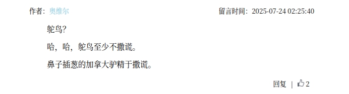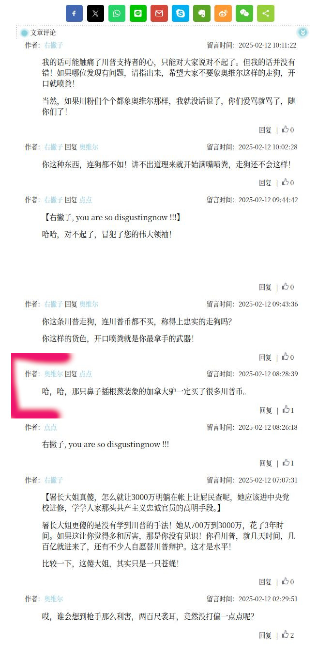 三、【你批川普扯谎,不如先照照留言区的镜子】 阿妞写到“川普扯谎没打草稿,现在也不能招供”,顺带嘲讽支持川普的人“被骗是真的,真的不骗你”。 此言一出,留言区立刻化身“高端川黑聊天室”,人人自带冷笑声波武器。 但请万维民主教母阿妞冷静一下: 川普是否撒谎,那得看证据。而你整篇文章没有任何证据,全靠猜想、投影和对川普人格的“文学描摹”,就下定论。