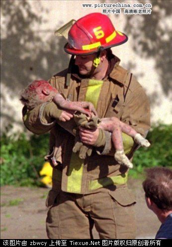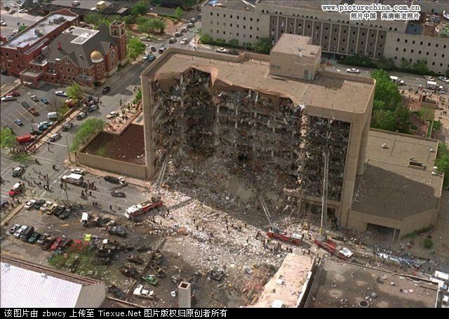 1995年4月19日上午9时04分,美国俄克拉何马城中心,“轰”的一声巨响,只见火光冲天,浓烟滚滚,响声和震动波及数十英里之外。瞬间,一座9层高大楼三分之一的墙面被炸得垮塌,碎石演飞,许多人血肉模糊,惨死废墟之中;共168人遇难。
