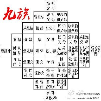 “九族”按第一种说法是上自高祖、下至玄孙,即玄孙、曾孙、仍孙(古时称从本身下数第八世孙为仍孙)、子、身、父、祖父、曾祖父、高祖父。第二种说法认为,父族四、母族三、妻族二;父族四是指姑之子(姑姑的子女)、姊妹之子(外甥)、女儿之子(外孙)、己之同族(父母、兄弟、姐妹、儿女);母族三是指母之父(外祖父)、母之母(外祖母)、从母子(娘舅);妻族二是指岳父、岳母。