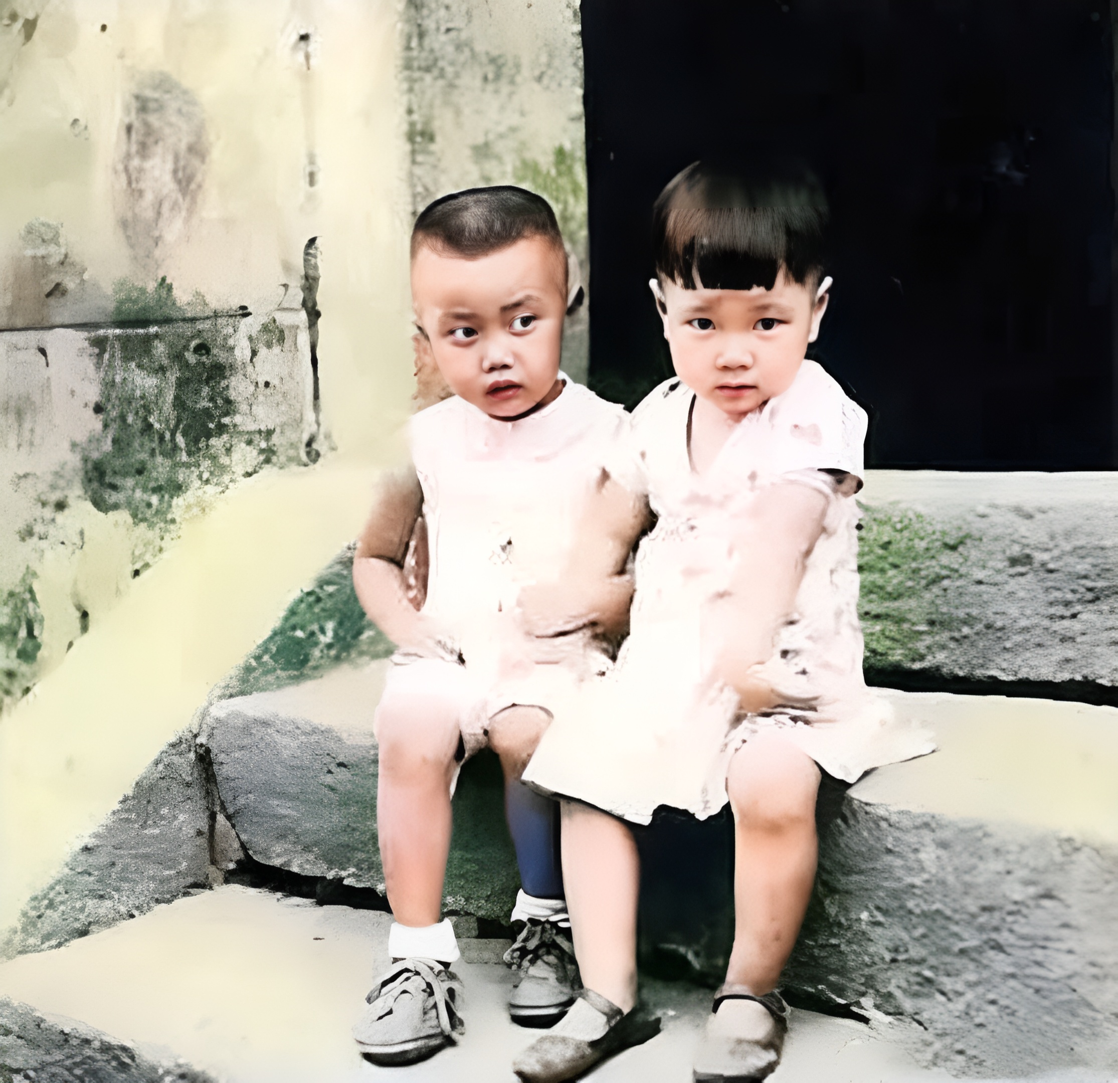 这两个坐在门口的小孩从小就被父母定了娃娃亲。可是,当两人再次相见后已是70年后。两人的父亲都是抗战时的著名将领,且都牺牲在抗日的战场上。小男孩名叫路月浦,他的父亲正是抗日名将路景荣。1937年淞沪会战中,路景荣所在的第98师也参与了这场战斗。当时,路景荣担任团级干部。死守宝山的姚子青营正是路景荣的部下。最后,路景荣牺牲在月浦镇。他的儿子后来改名路月浦。小女孩名叫王文黎,她的父亲是抗日英雄王禹九。王禹九与路景荣不仅同在第98师担任团级干部,还是同龄。两家关系极好,且定下了娃娃亲。路景荣牺牲后,王禹九负责照顾他的妻儿。不幸的是,王禹九在南昌作战时壮烈殉国。此后,两家人渐渐失去了联系。70年后,当路月浦见到王文黎时都已是白发苍苍的老人。