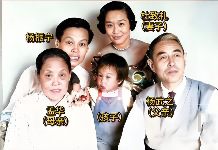 杨振宁,杜致礼夫妇和父亲杨武之,母亲罗孟华的一张合影。中间的小朋友是杨振宁的孩子