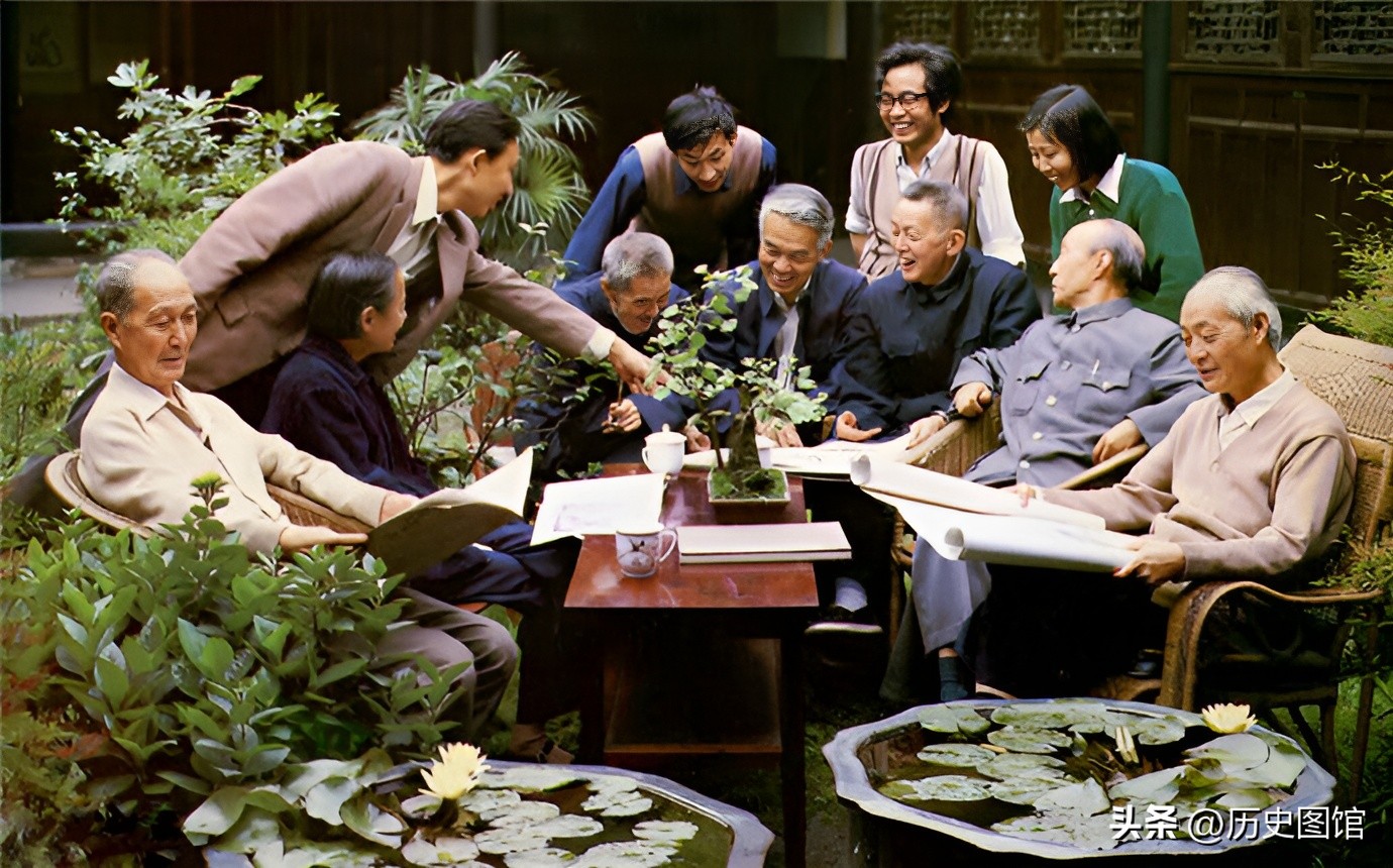 1984年,在一个古色古香的宅院里,几名老画家围坐在一起,仔细观看美术新作,现场欢笑声不断。