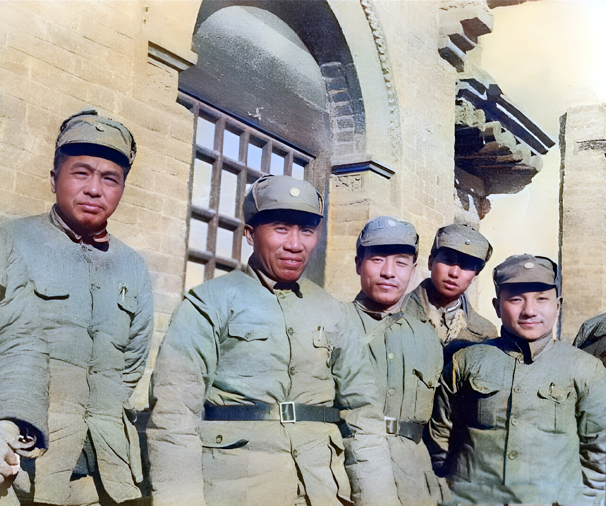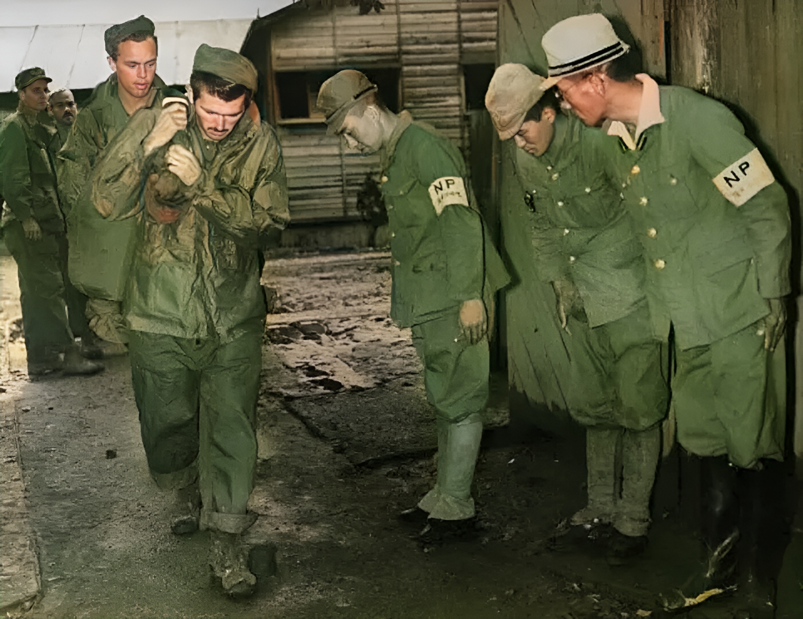 这是日本投降后曾被关押的美军战俘从战俘营中走出来。曾经嚣张的日寇看守者恭恭敬敬地站在战俘营的大门前鞠躬道歉
