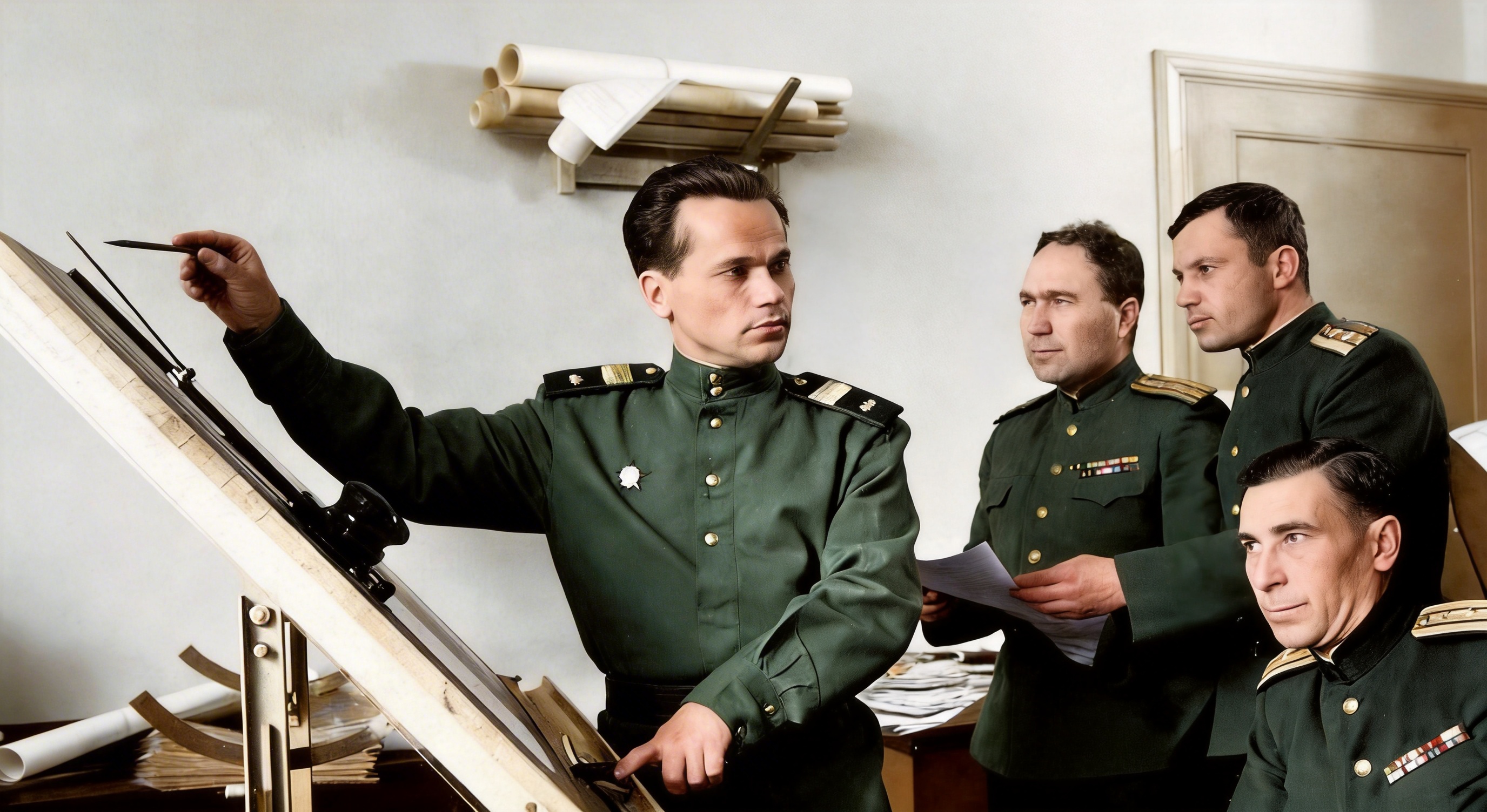 年轻时的AK-47之父卡拉什尼科夫在给领导讲解自己设计的枪械