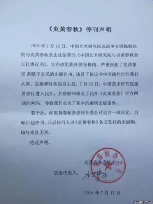 鉴于此,经过炎黄春秋杂志社社委会讨论并一致决定,自即日起(昨日,即7月17日)停刊,此后任何人以《炎黄春秋》名义发行的出版物,均与“本社”无关。