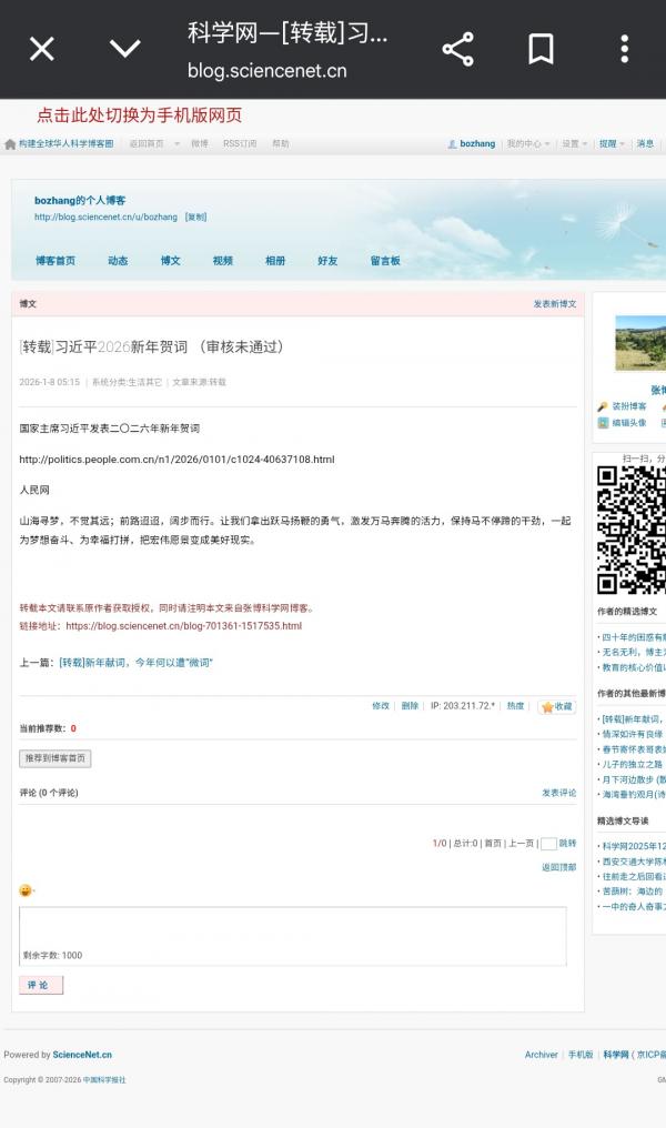 科学网转发习近平2026年新年贺词, “审查未通过”