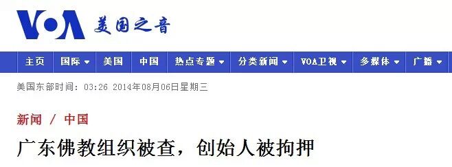 8月5日美国之音发布文章——《广东佛教组织被查,创始人被拘押》。