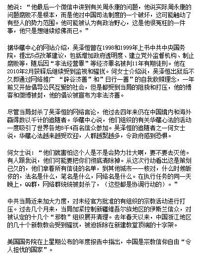 何女士提到,吴泽恒还发表了有关周永康案的一些看法,可能触动了当局的神经。