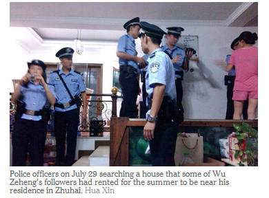 According to several witnesses, the police entered Mr. Wus home in Zhuhai on July 29 saying they wanted to examine his residency registration papers and then took him away. A number of followers living in apartments in the same complex were also detained at the same time, including children who were studying meditation and martial arts. Meanwhile, the police in the nearby city of Shenzhen raided two businesses affiliated with Huazang Dharma and the homes of people working there.