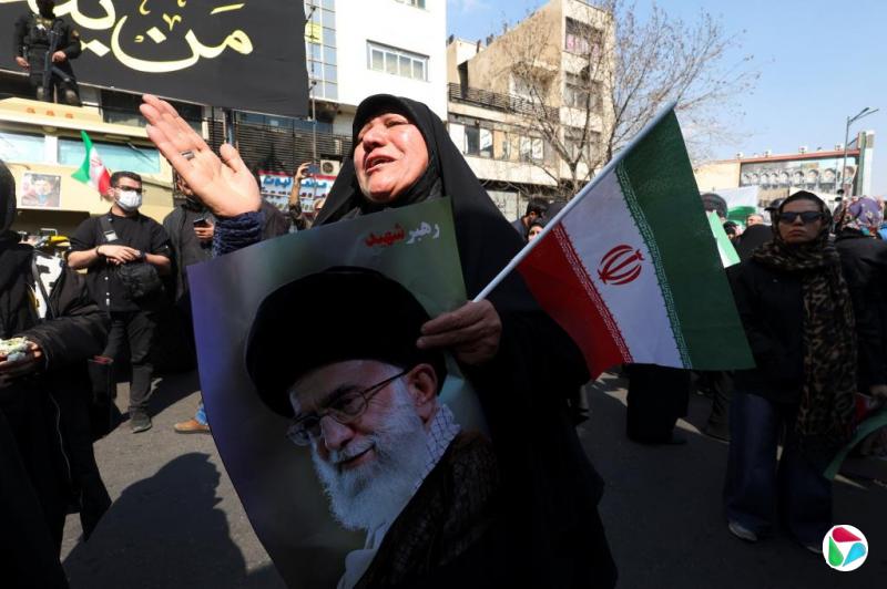 一名妇女星期三(3月18日)在伊朗德黑兰市中心的恩格拉布广场(Enghelab Square),手持伊朗已故最高领导人哈梅内伊的画像,悼念在空袭中遇难的伊朗最高国家安全委员会秘书拉里贾尼,以及被美国潜艇击沉的伊朗“德纳号”(IRIS Dena)军舰遇难者。(路透社)