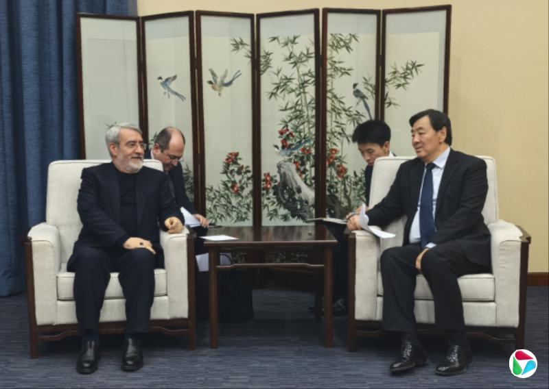 中国政府中东问题特使翟隽(右)星期五(3月20日)在北京会见伊朗驻华大使法兹里,双方就当前中东地区紧张局势交换意见。(中国外交部官网)