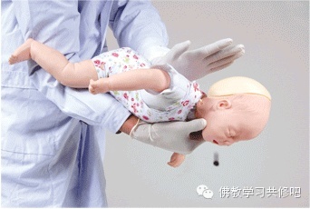可以采取另外一个姿势,把孩子翻过来,躺在坚硬的地面或床板上,抢救者跪下或立于其足侧,或取坐位,并使患儿骑在抢救者的大腿上,面朝前。抢救者以两手的中指或食指,放在患儿胸廓下和脐上的腹部,快速向上重击压迫,但要很轻柔。重复,直至异物排出。