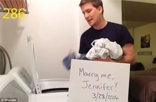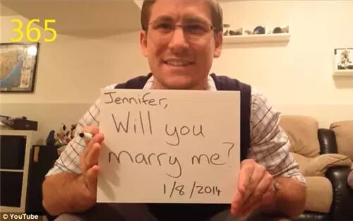 一年前,Dean Smith开始每日在女友未发觉的情况下,用一块白板写下自己的求婚宣言。图片中的Dean身着不同衣服,出现在不同场景里,也许在刷牙,也许在遛狗,也许在做家务,唯一不变的就是那句“Jennifer,你愿意嫁给我吗。”