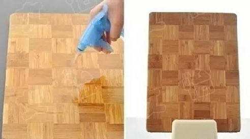 然后用冷水冲洗干净,再将白醋和水以1:2的比例调好后倒入喷壶中,喷在案板的表面,然后放到通风的地方,自然风干即可。