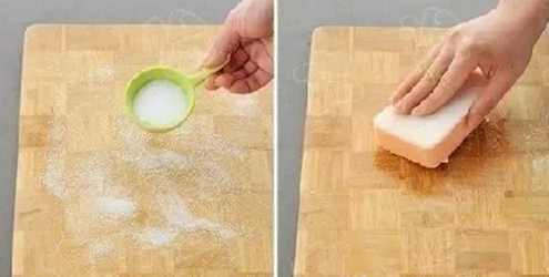 先用洗洁精和清水把案板清洗干净,然后在案板上撒一勺盐,用洗碗海绵蘸一点点水后,反复擦拭案板的表面,