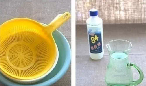 将84消毒液和清水,以1:200的比例兑在一起,将需要“换肤”的塑料制品放入,浸泡两个小时。