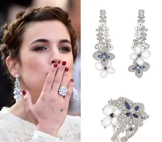 3)甜美的西班牙女演员阿德丽·安娜戴的这两款珠宝,均来自尚美巴黎的Voie Lactée系列。蓝色“小花”点缀在耳畔和指间,让女神的气质变得清新、灵动了。
