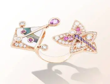 丢掉婚戒吧! 十大时尚戒指,总有一款戳中你! 1)如果你喜欢少女风,或者想让自己更年轻?充满夏日向日葵般的朝气蓬勃?那么……梵克雅宝一定会让你心花怒放!  (Cerfs-Volants 2枚坠饰指间戒,选用的宝石有粉红色蓝宝石、紫色蓝宝石、白色和灰色的珍珠以及圆形钻石。)