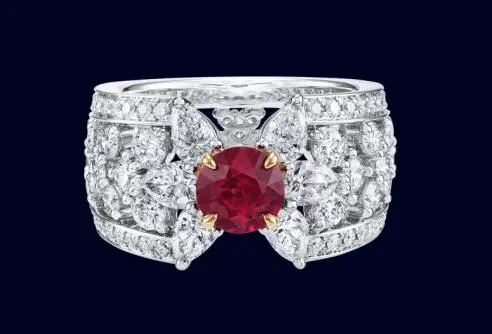 7)海瑞温斯顿的粉丝有伊丽莎白女王、温莎女公爵、好莱坞的知名影星玛丽莲·梦露等。这个享誉全球,超过百年历史的超级珠宝奢侈品牌,凭借绝妙的切工,总能让一般的宝石被“点石成金”。  (海瑞温斯顿的这枚红宝石戒指,选用了1颗圆形明亮式切工的红宝石和125颗水滴型、圆形明亮式切工的钻石,总重达到4.03克拉,戒身则是铂金,给人第一感觉就是:我的天!这得多贵呀?)