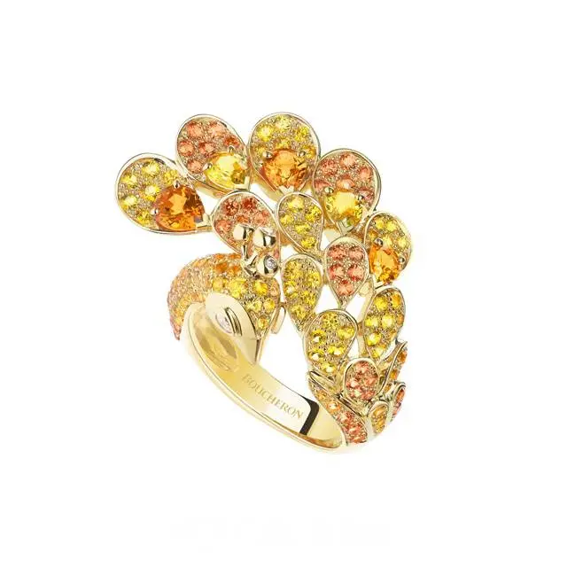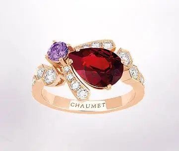 (宝诗龙的孔雀戒指,镶嵌了蓝宝石、珍珠和钻石,是美丽女士的灵魂伴侣。这款戒指的设计取自古罗马神话,守护巨人Argus的百目被杀后,宙斯的妻子将他的眼睛镶嵌在孔雀的羽毛上,以此表达对其忠诚的敬意。) 6)中国女星最爱的品牌——尚美巴黎,创始于1780年,是路威酩轩集团拥有的历史最悠久的法国皇家级别的珠宝品牌,被誉为“低调奢华的典范”。  (bee my love系列,中文译为“蜂·爱”,意为疯了的爱、甜蜜的爱、无私的爱,戒身镶嵌了一颗紫色蓝宝石、一颗红色石榴石和若干钻石。虽然没有用到什么高档宝石,但是凭借精巧的设计和美好的寓意,依然俘获了喜欢奢侈品的女人们的心。)