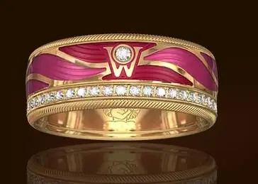 (Tango系列镶嵌了冰钻、绿色蓝宝石、蓝宝石和沙弗莱石,其设计理念采用了中国元素“链环”,有吉祥如意的美好寓意。) 10)德国的“华洛芙”是拥有百年历史的世界著名珠宝品牌,独家设计的旋转式珐琅指环,给人丝绸般柔顺质感。  (热情的红色冷珐琅闪耀着微光,灿烂的白色钻石则更加耀眼夺目,这枚指环由三层珐琅烧制而成,每层珐琅都雕刻了不同的图案,可以旋转把玩,并从不同角度完美地呈现色彩的变化。)