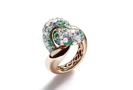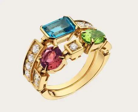 3)来自意大利的宝格丽擅长将不同颜色的宝石搭配在一起,唤醒女性对自己生命的新认识,是继卡地亚、蒂芙尼后的世界第三大珠宝品牌。  (color collection双环戒指,镶嵌了粉红色碧玺、橄榄石、蓝色托帕石以及若干钻石。这枚戒指为我们描绘了一个蓝天白云为背景下的艳阳天,佩戴者躺在青青的草地上,和心爱的人依偎在一起,互相倾述爱意。)