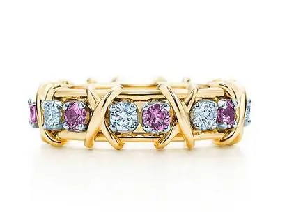 2)蒂芙尼不是最贵的奢侈品,却有独特的设计和精细的做工,能给女人安全感。而且提到它,就会让人想到奥黛丽·赫本。也是因为这位女神,蒂芙尼从此就成了优雅和俏皮完美结合的代名词。  (符号“X”象征爱情,戒指上镶嵌了钻石和粉红色蓝宝石。除了佩戴在纤纤玉指上,你还能用一根18K的金项链,把它串起来戴在锁骨间。)