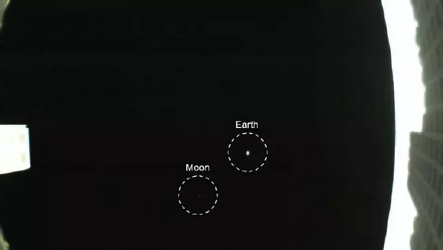 地球和月球,5月9日由MarCO立方体卫星拍摄,右边是它的高增益天线,这是它传回的首张照片。 Credits:NASA/JPL-Caltech
